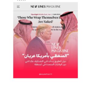• وقال ( فواز جرجس ) من كلية لندن للاقتصاد إن الحرب هزّت هذه الافتراضات ، وأضاف أن دول الخليج ستسرّع الآن جهودها لتنويع شراكاتها الخارجية والأمنية بعدما أدركت أنها “لا تستطيع في الحقيقة الاعتماد على الولايات المتحدة لحماية طاقتها ونفطها وغازها وشعوبها وسيادتها”.